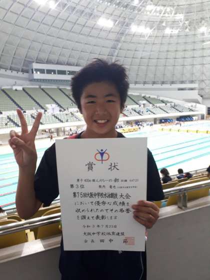 大会2日目の男子400m個人メドレーで3位に入賞し、近畿大会の出場も決まりました。