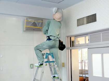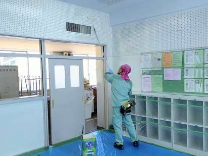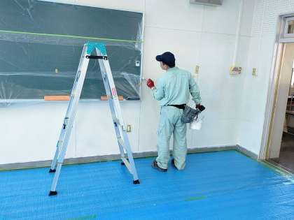 昨日から金曜日まで、大阪市の校園営繕園芸事務所より営繕3班4名の方にお越しいただき、2年生教室の塗装をしていただいてます。
