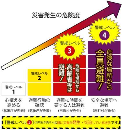 さて、令和元年から大阪市における水害時の避難情報の伝え方が「避難準備・高齢者等避難開始」等から「警戒レベル3」等に変更となりました。一方、気象庁等から出される防災気象情報にも「警戒レベル3 相当情報」等があり、大変分かりにくい状況となっています。