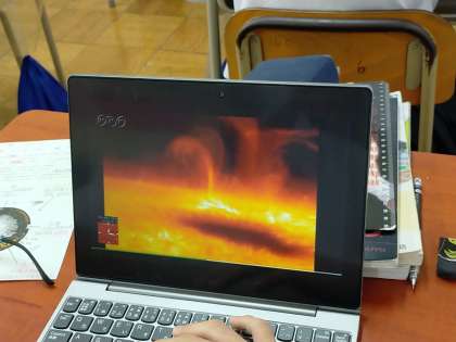 先生の豪快な黒板の絵で説明を聞いた後で、(NHK for school)で『太陽の表面』の様子を動画で見ています。