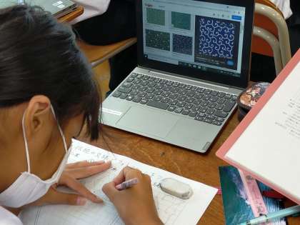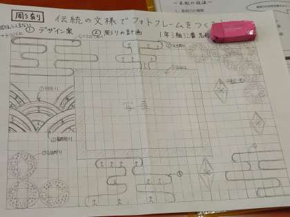 1年生は、彫刻で『伝統の文様でフォトフレームをつくろう』という授業をしています。