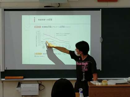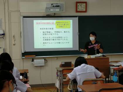 3年生女子は保健分野の『飲酒の害と健康』について学んでいます。