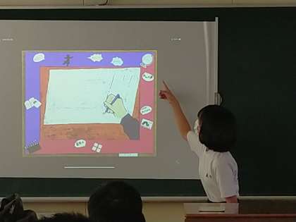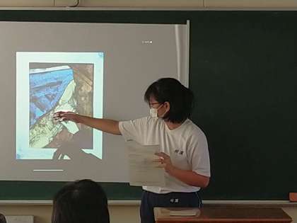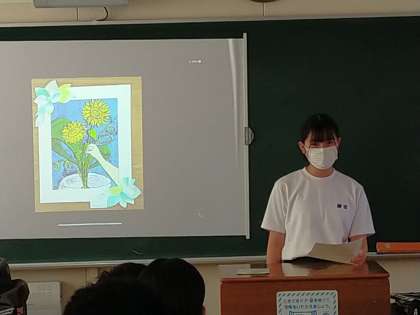 工夫したところや苦労したことなど、自らの作品の紹介をみんなの前でしています。