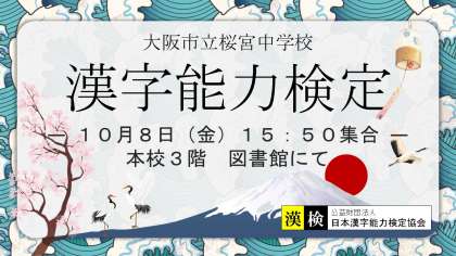 10月8日(金)は漢字能力検定(漢検)が実施されます。15:50集合となっていますので、間違えのないよう気をつけてください。