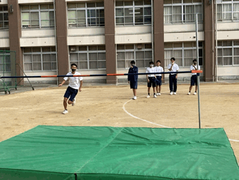 先生いわく「ほとんど練習していないのにココまで跳べるなんてビックリ!」3年生は運動能力の高い生徒が多いとのこと。真正面から見る背面跳びは、なかなかの迫力です。