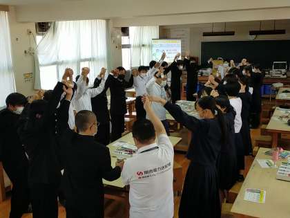 最後は、みんなが手をつなぎ、身体に電気を流しました。