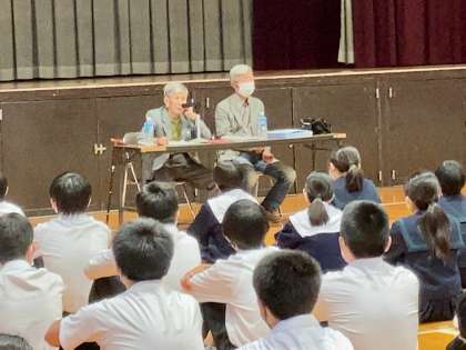 年齢は102歳とのことでしたが力強く話をしていただき、目の前で人が死んでいく戦争を「さびしい」とおっしゃっていました。また、息子である吉村 五一(よしむら ゆきかず)さんからもお話を伺い、「父が生きてくれたことで私がいる。命はつながっている」というお話に、子どもたちはもちろん我々教職員も戦争の悲惨さと命の大切さを強く感じました。