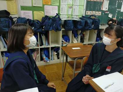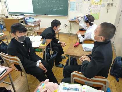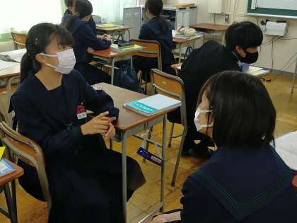 2年生の英語の時間ですが、二人組で楽しそうにしゃべっています。