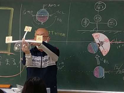 教室の真中のボールを太陽に見立てて、先生が地球になって教室を一周します。