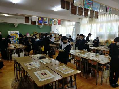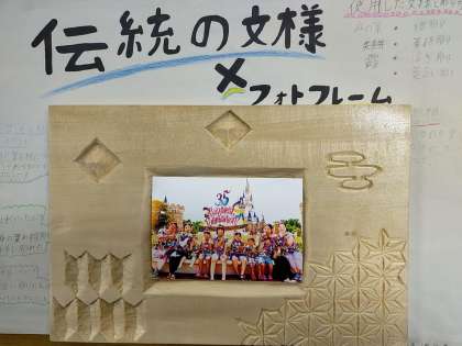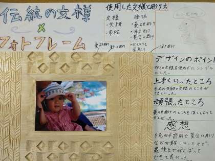 1年生が完成した『伝統文様×フォトフレーム』の発表会をしています。