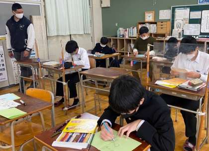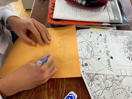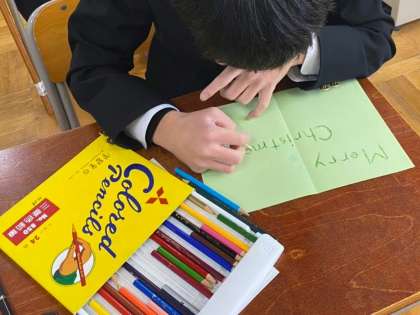 学習室の子どもたちが、クリス先生からクリスマスカードの作り方を教えてもらいました。