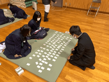 やっぱり歌を覚えている人は取るのが早いですね。あとは札の置かれている場所を覚えると、もっと早くとれますよ!1年生のみんなで百人一首大会ができるのを楽しみにしていますね。