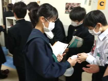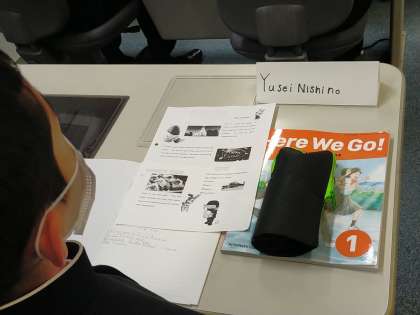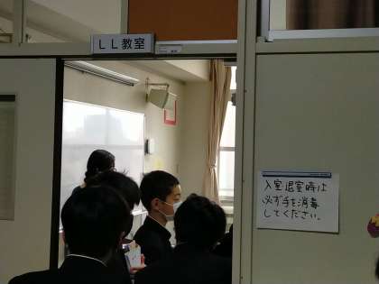 1年生が初めてLL教室を使っています。まずは移動の仕方や、教室に入る時のルールなどを覚えます。