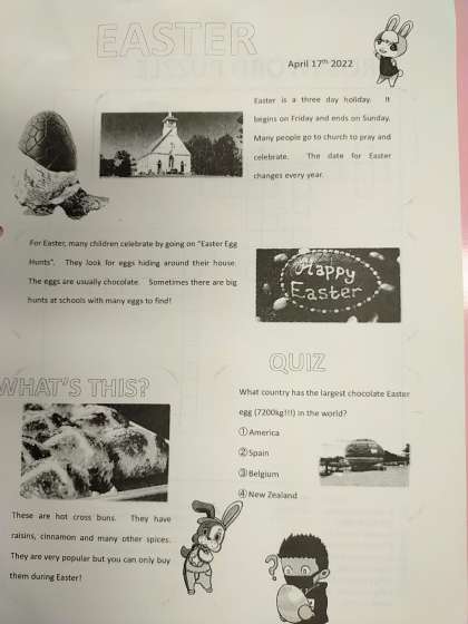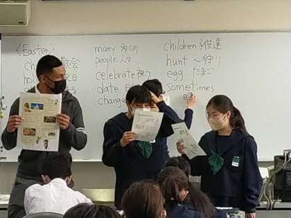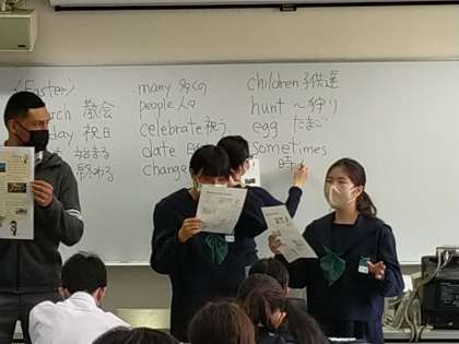 C−NETのクリス先生の会話を代表生徒が聞き取り、日本語にしています。後で田中先生が難しそうな単語の日本語訳をホワイトボードに書いています。