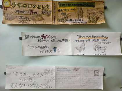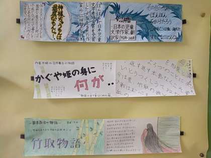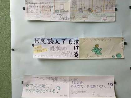 2年生が1年国語の教科書に載っている単元を「本の帯」にしました。