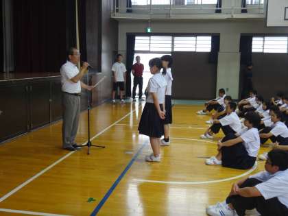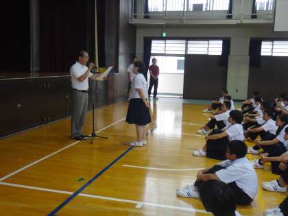 6/8(月)全校集会が行われ、先日行われた大阪市春季総合体育大会において女子バスケットボール部が第3位、卓球部が第3位を獲得し表彰されました。
