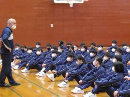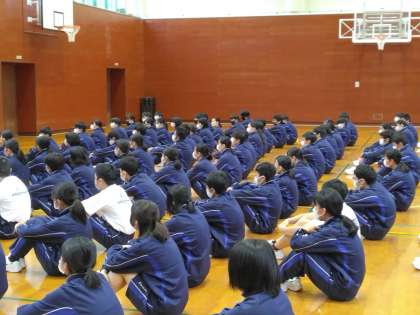 朝露で芝生が濡れているのと雨が少し心配なので、体育館で行います。
