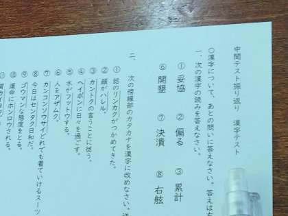 2年の国語では、『中間テスト振り返り 漢字テスト』をやっています。