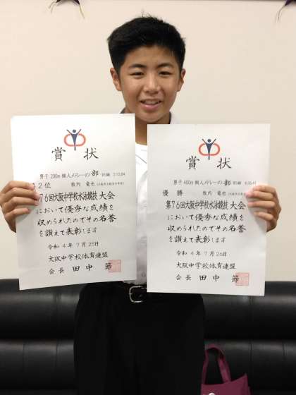 水泳部の2年生、牧内竜也君が府大会で400m個人メドレーで優勝、200m個人メドレーで2位という立派な成績を残しました。