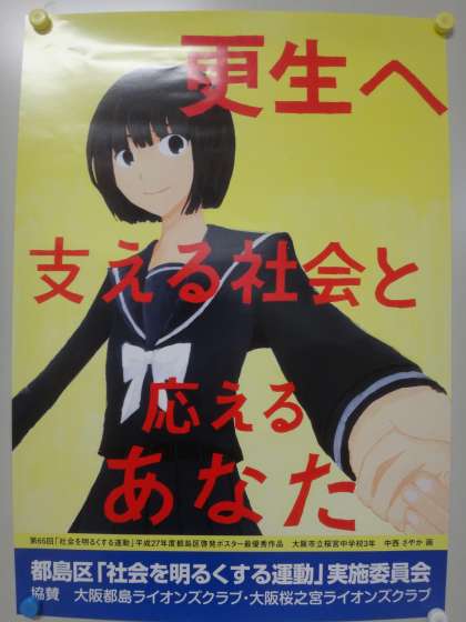 第65回「社会を明るくする運動」都島区啓発ポスターで金賞を受賞された、美術部の中西さやかさんの下記作品が啓発ポスターとして本日7月1日(水)より区内各所にて掲出されます。
