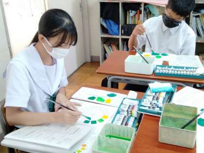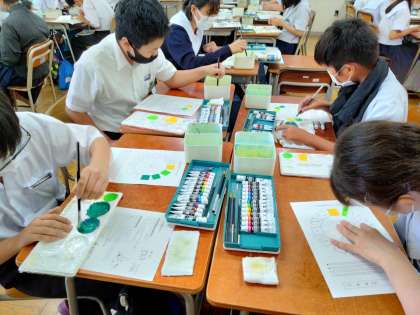 1年生が美術の時間に、教室でポスターカラーで色を塗っています。