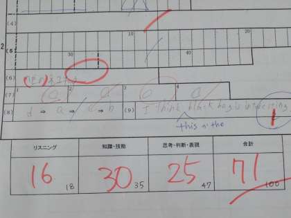 もっとよく見ると、リスニング18点中の6点、知識・理解35点中の30点、思考・判断・表現47点中の25点と、細かくわかるようになっています。