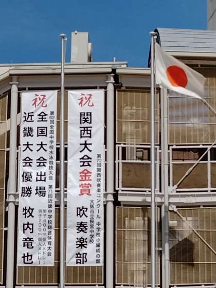 近畿大会で優勝するとともに全国中学校水泳競技大会に出場した水泳部の牧内竜也君と、関西吹奏楽コンクール小編成の部で金賞を受賞した吹奏楽部の活躍を祝して、垂れ幕が作られました。