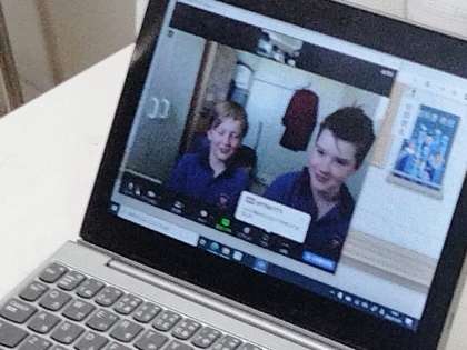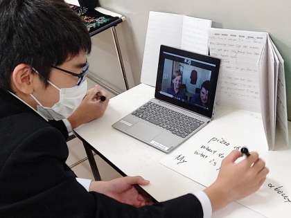 ニュージーランドの子どもたちと、簡単な英会話と筆談ボードでコミュニケーションをとっています。