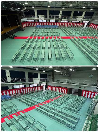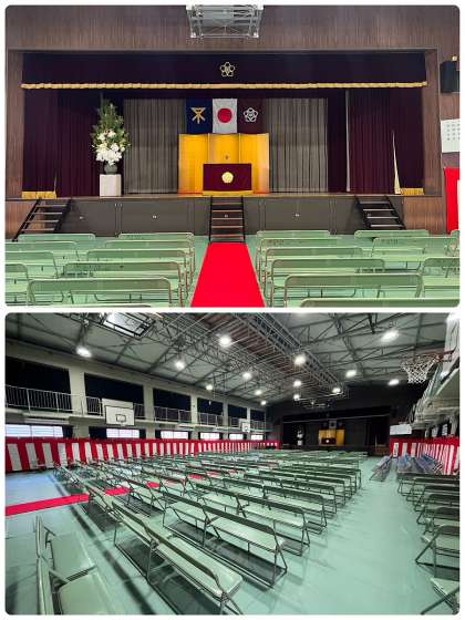 在校生のみなさんのお手伝いもあり、入学式の会場は完成しております。