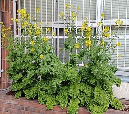 葉っぱがワサビ味の『わさびリーフ』ですが、巨大化して黄色い花が咲いてます!
