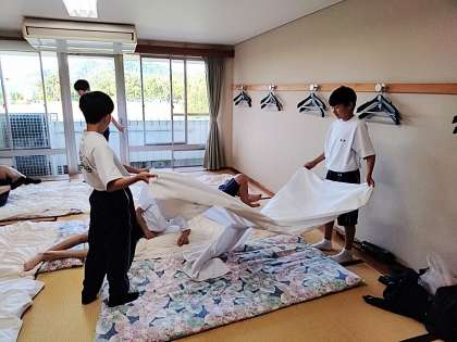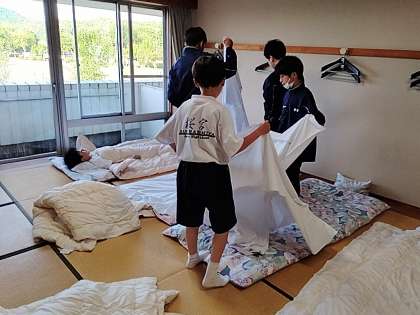 お風呂からあがった1組は、もう布団を敷いています。