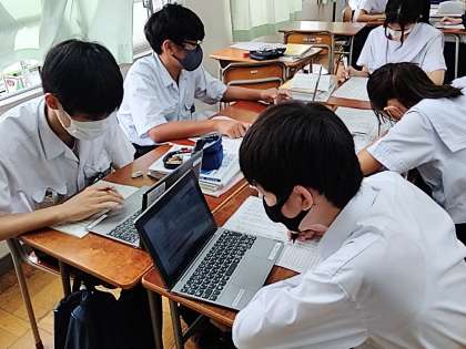 一人ひとりがタブレットや国語便覧を参考にしています。