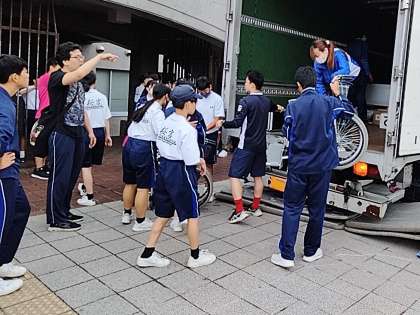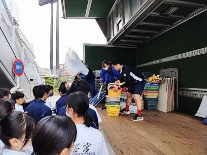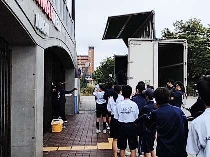 8時の開門に合わせてトラックが到着し、先発隊のみんなで運び込んでいます。