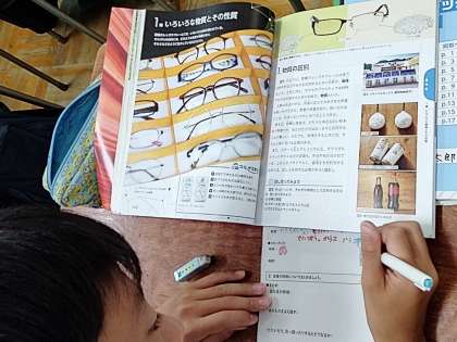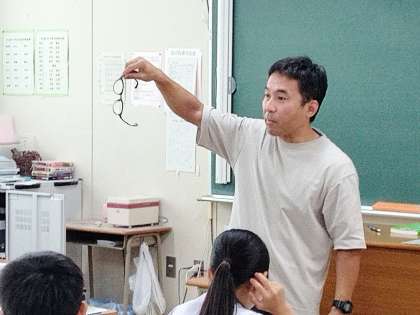 1年生の理科の授業を見にいくと、小野先生がメガネを子どもたちに見せています。