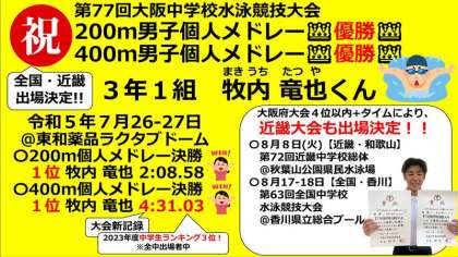 前回の記事【下の文字をクリック】でもお知らせしましたが、3年1組の牧内竜也くんが近畿大会に出場します。