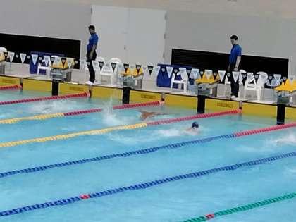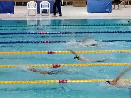 バタフライをトップでおりかえし、背泳で差をひろげています。