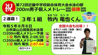 桜宮中学校からは、3年1組の牧内竜也くんが男子400m個人メドレーに出場します。