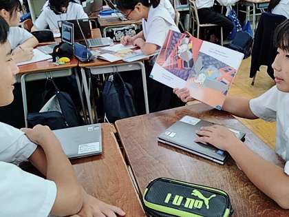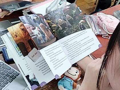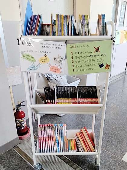 廊下に英語の本がいっぱい並んだブックラックがおいてあります。教室を見ると、2年生の英語の時間です。