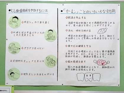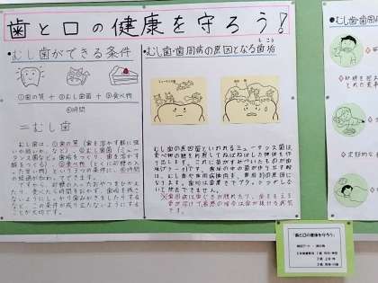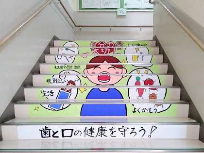1階からあがる階段に『歯と口の健康を守ろう』の階段アートがあります。