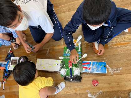 桜宮幼稚園 廃材を使って園児と一緒に飛行機を作っています。