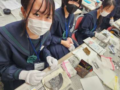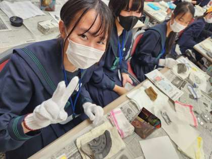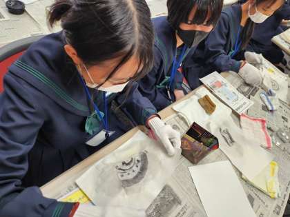 小学生向けの遺跡の拓本を一緒に行っています。このあと、小学生のみんなにコツや歴史などを教えるそうです!