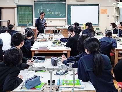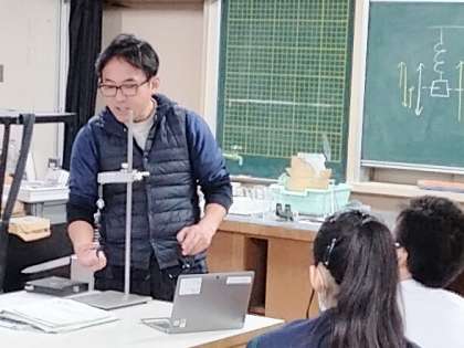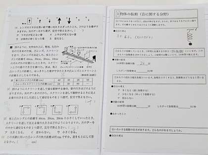 小野先生が前で実験をして、みんなで何回揺れるかを数えています。