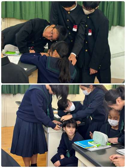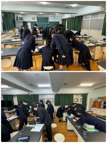 1年1組が理科室にて「音による現象の理解」に関する授業を受けています。