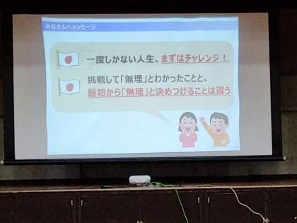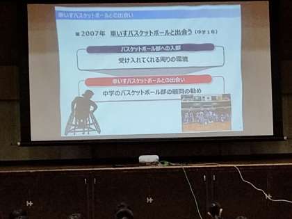 今日は日本代表の北間優衣選手に来校いただき、生い立ちから車いすバスケットボールとの出会い、そしてパラリンピック挑戦までのお話を聞かせていただきました。