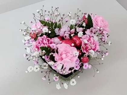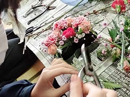 華道部では『バレンタインバージョン』のアレンジメントフラワーを作っています。