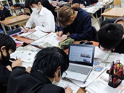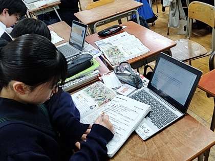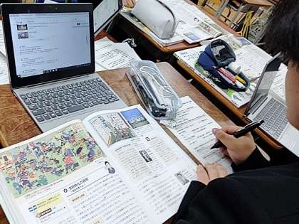 教室の前で中橋先生が授業を進めていますが、子どもたちは資料集を見たりタブレットで調べたりしながら学びを深めています。