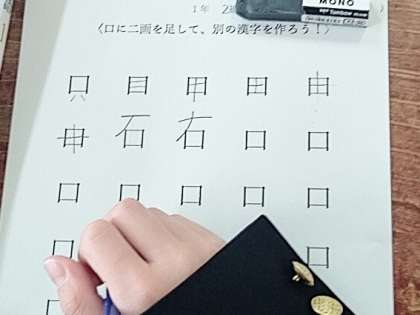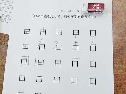 自己紹介カードができた子どもたちは、口に2画加えてできる漢字を考えています。