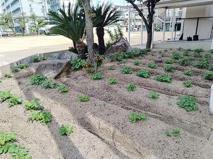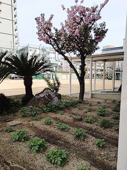 昨年度末に植えたジャガイモが、八重桜の下で大きくなって来ましたよ〜!
