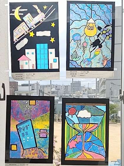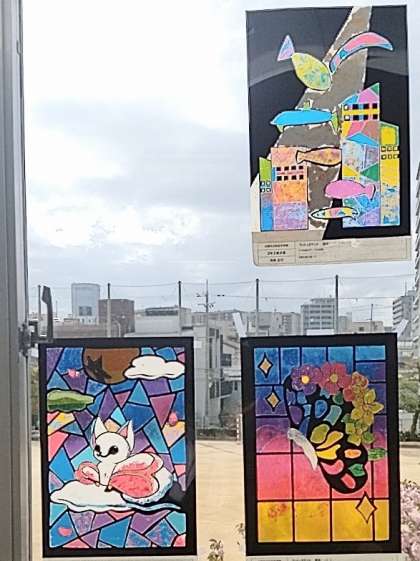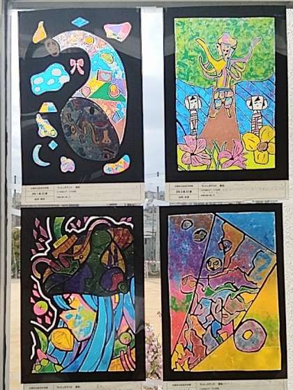 3年生の廊下には、3年生の子どもたちが2年生時に美術で作った『プッシュステンド』が貼ってあります。