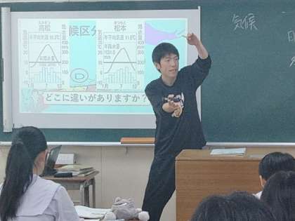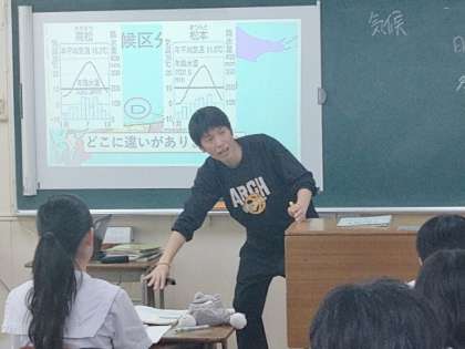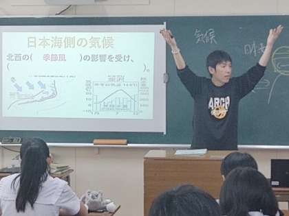 樋下先生が全身を使って、日本の天候の特徴を説明しています。しっかり覚えようね。